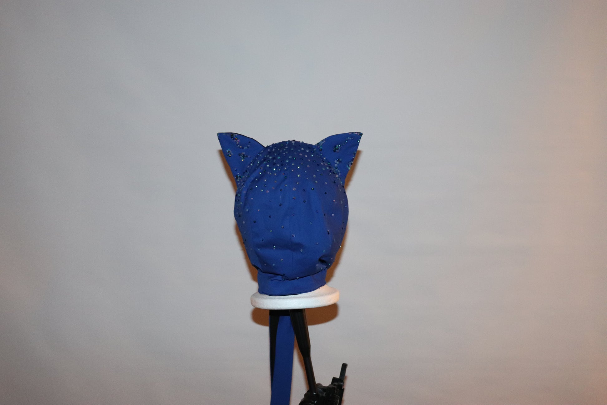 Crafted from 100% cotton, this blue and black cat ear hat offers both comfort and breathability. The bedazzled embellishments add a touch of sparkle, making it a striking accessory for those who want to combine playful feline style with subtle glamour. Perfect for anyone seeking a unique blend of quality fabric and eye-catching design.